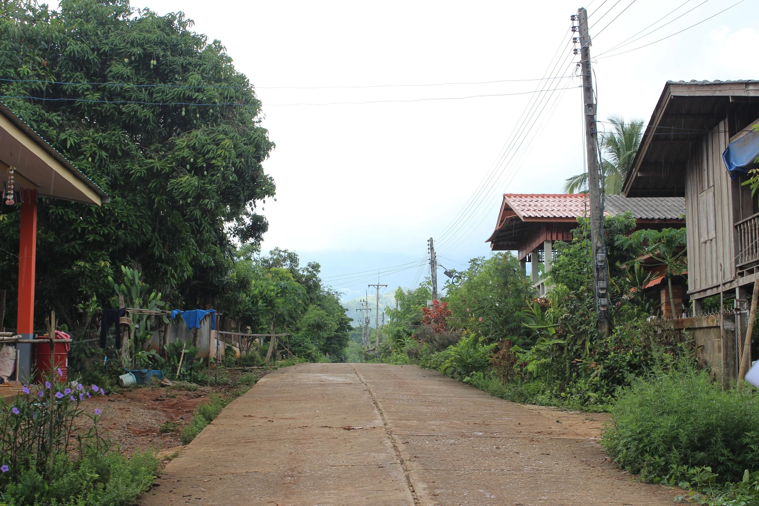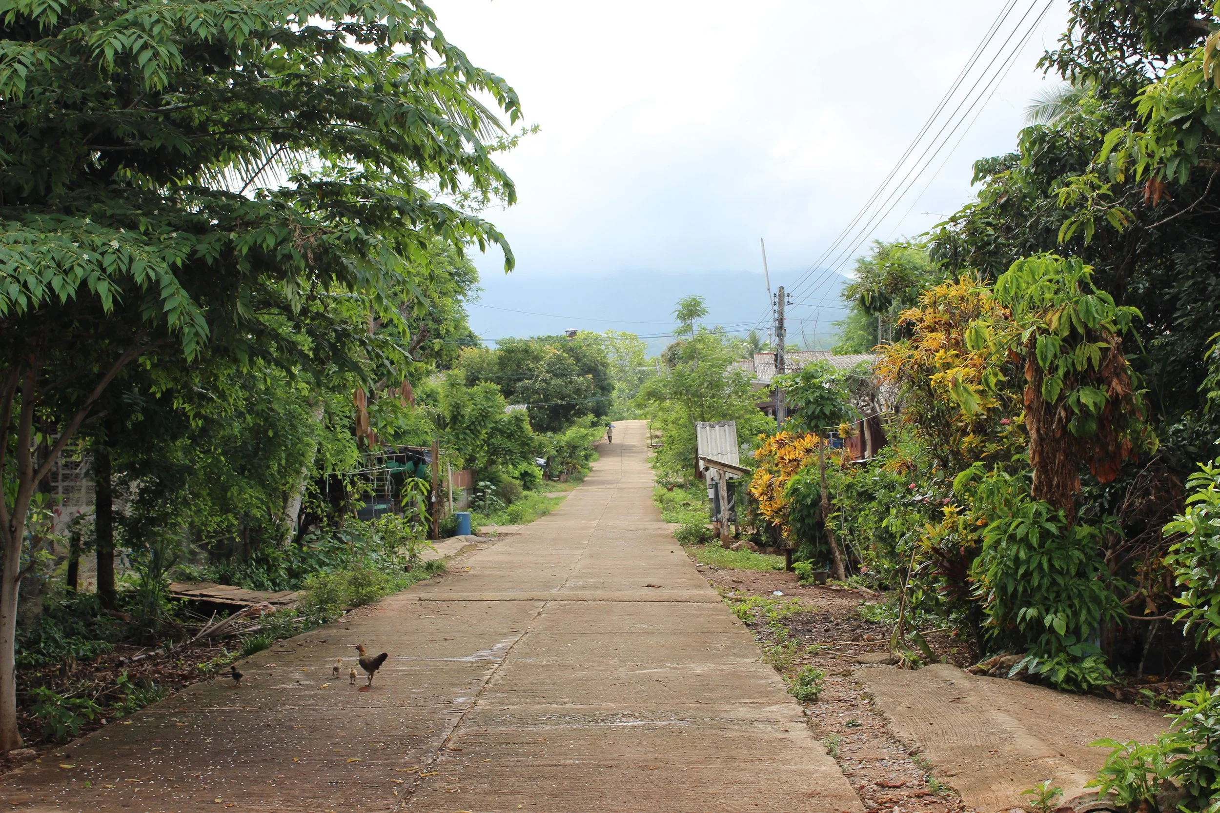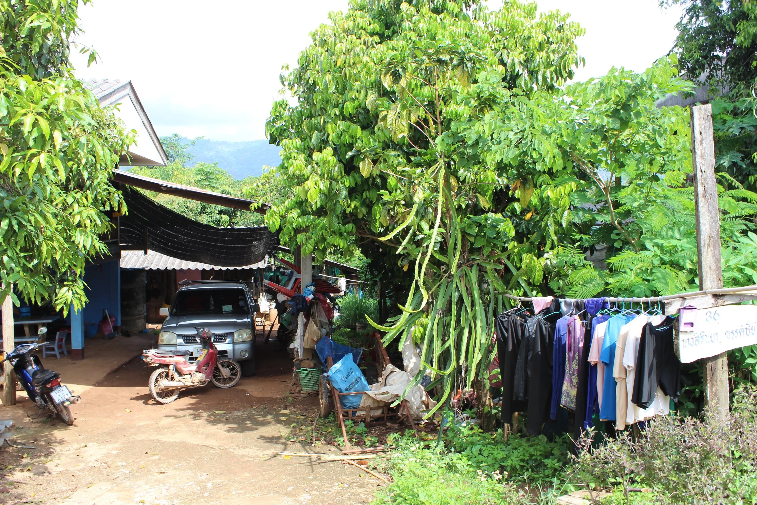 As we walked, I saw houses with cars and motorbikes parked outside, a village shop, and an incredible range of edible plants growing in the village gardens of many households. Sawang pointed out the plants as we walked past them – holy basil, coffee, lime, lemongrass etc.