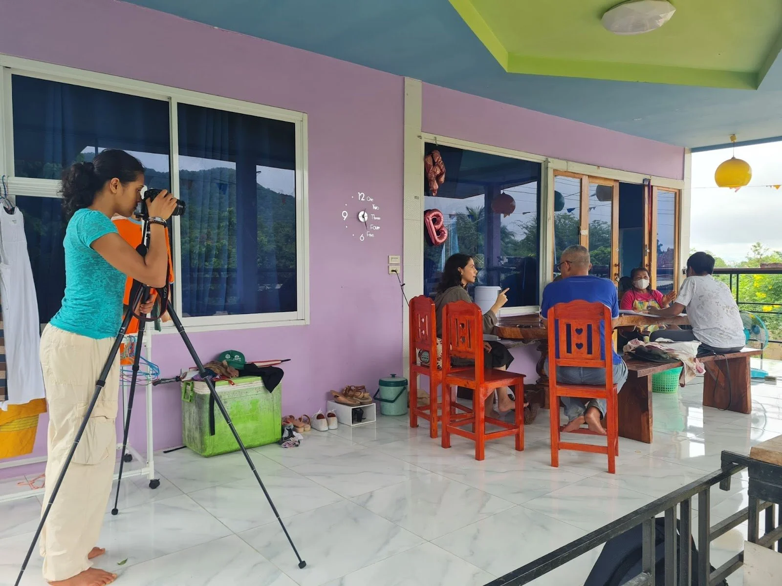 We sat at tables on the porch, and water bottles were handed out as the research team prepared their stacks of interview papers. Two local women from the region were helping as data collectors and needed to be briefed. Motorbikes leaned against the wall, and the wife of the village head sat on a rug on the first floor cracking peanuts.